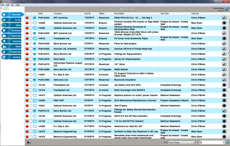 The Overview is one of Obatics many unique features. When you log in, you are presented with a list of tasks that you or your team need to address. To Dos, Messages, Projects, Quotations, Purchases, etc. are all organized by action date. At a glance you can see what is the next action to take for each item on the list, who the action is assigned to and when it needs to be done by.